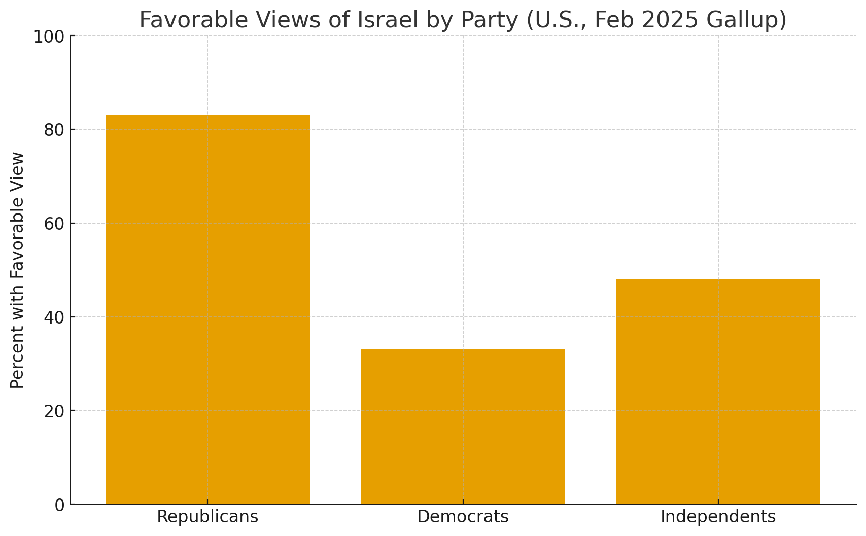 Republicans overwhelmingly support Israel, bolstered by Christian Zionists prominently positioned in the GOP, while support amongst self-identifying Democrats has dipped below 30%. Independents are split basically down the middle.